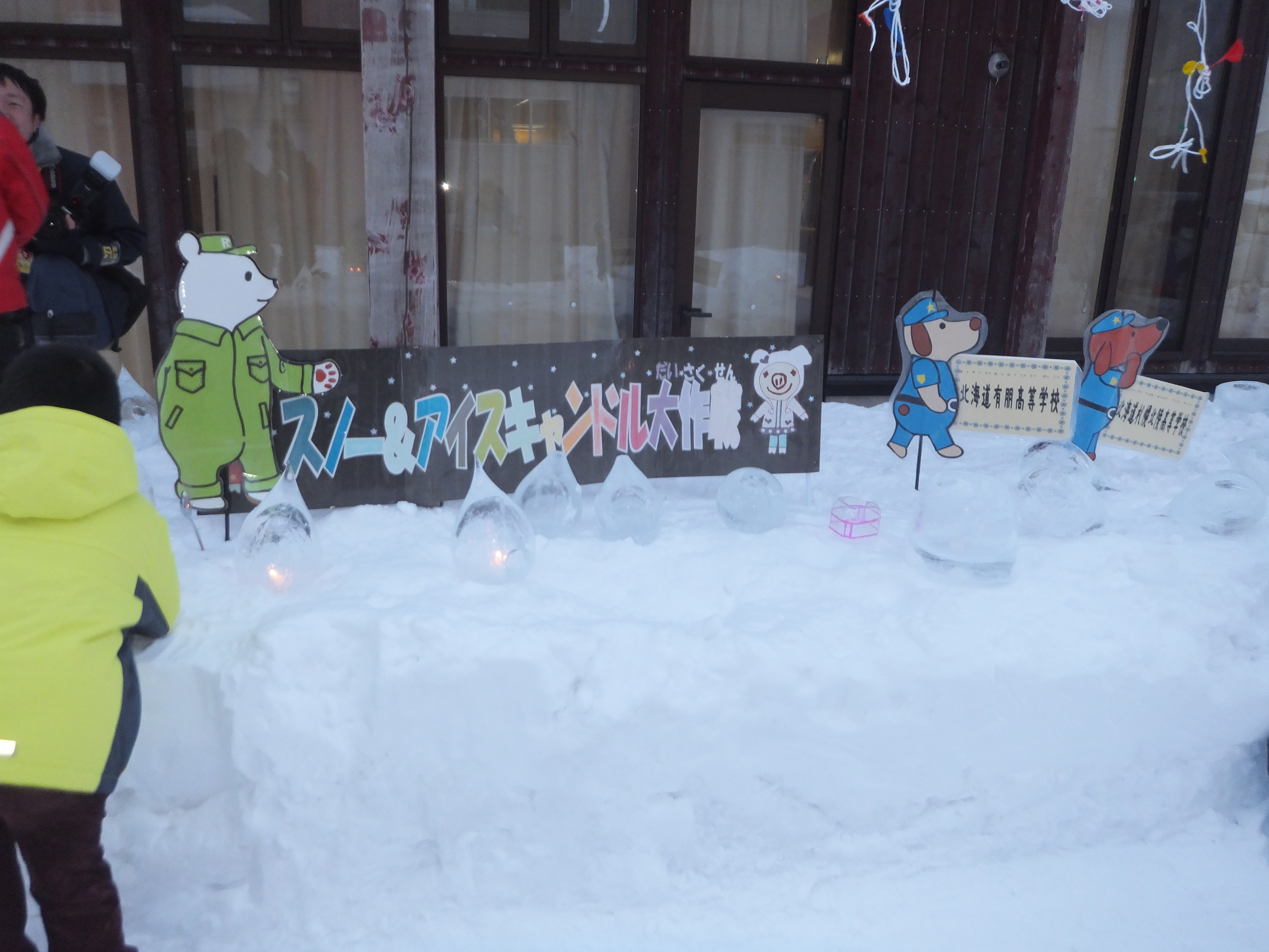 子供たちのために有朋高校の除雪ボランティアの皆さんが土台を作り、キャンドルを飾って完成しました。